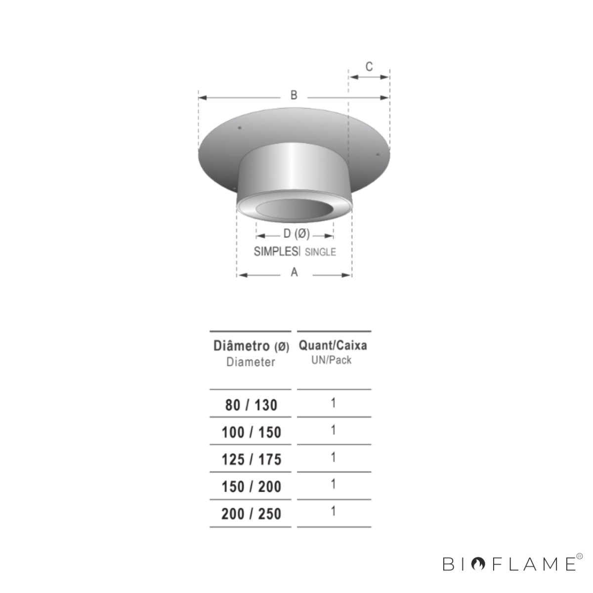 - Diâmetro: 80/130, 100/150, 125/175, 150/200, 180/230, 200/250