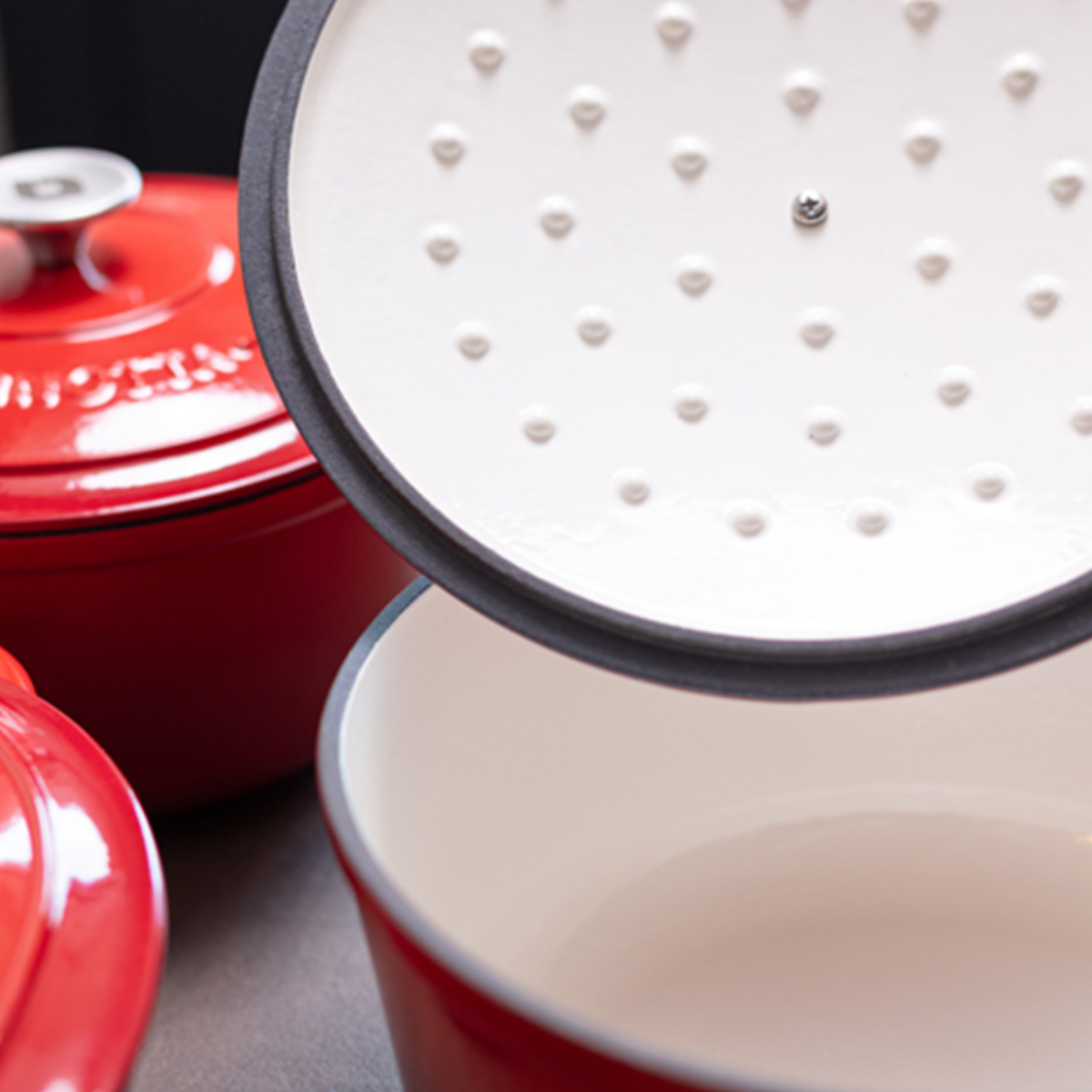 O interior esmaltado claro facilita a limpeza e é perfeito para preservar os sabores autênticos dos alimentos. A tampa com textura de pinos retém o vapor e devolve-o aos alimentos, intensificando os aromas naturais. O design ergonómico com pegas resistentes ao calor (até 240 °C) permite um manuseamento confortável e seguro, mesmo com luvas.