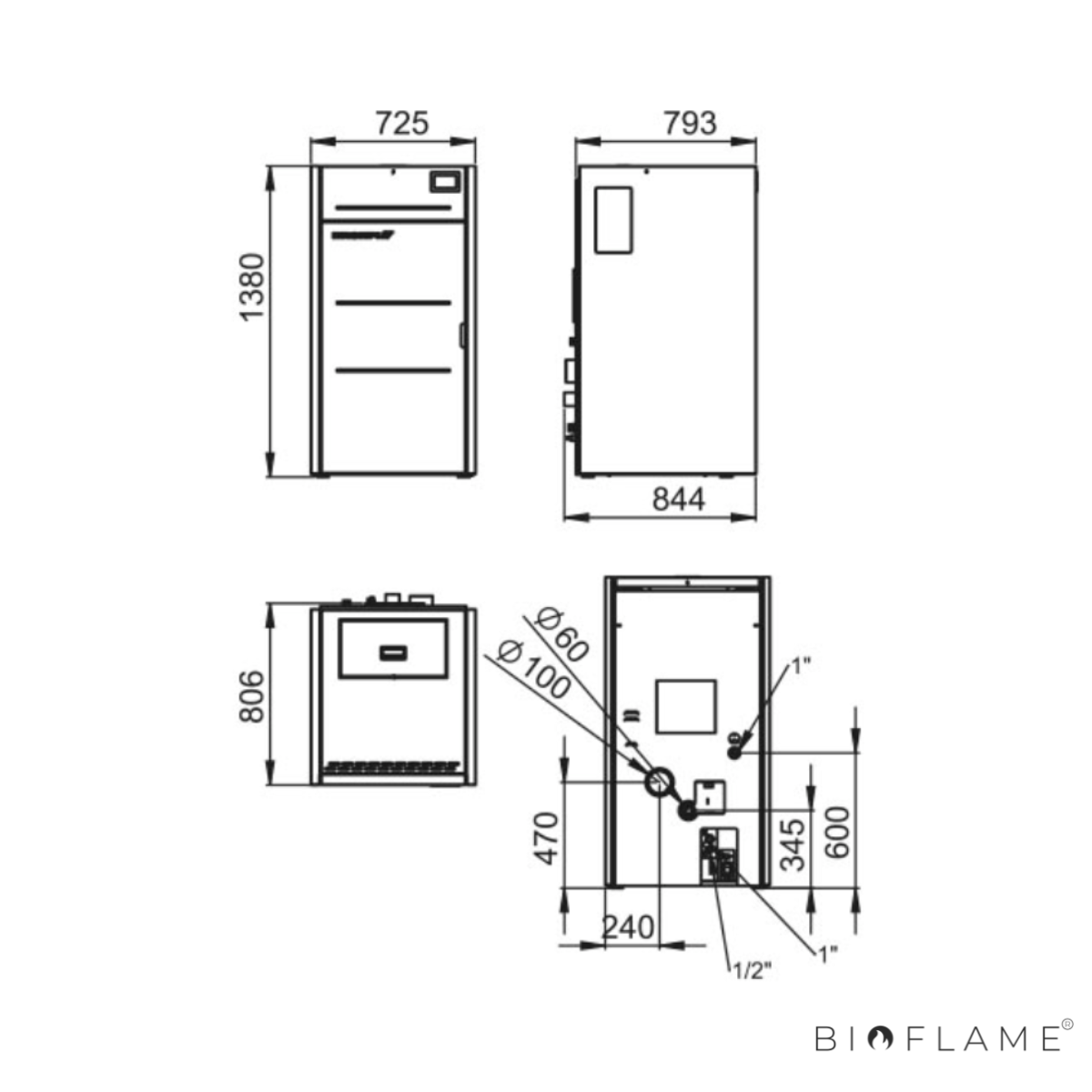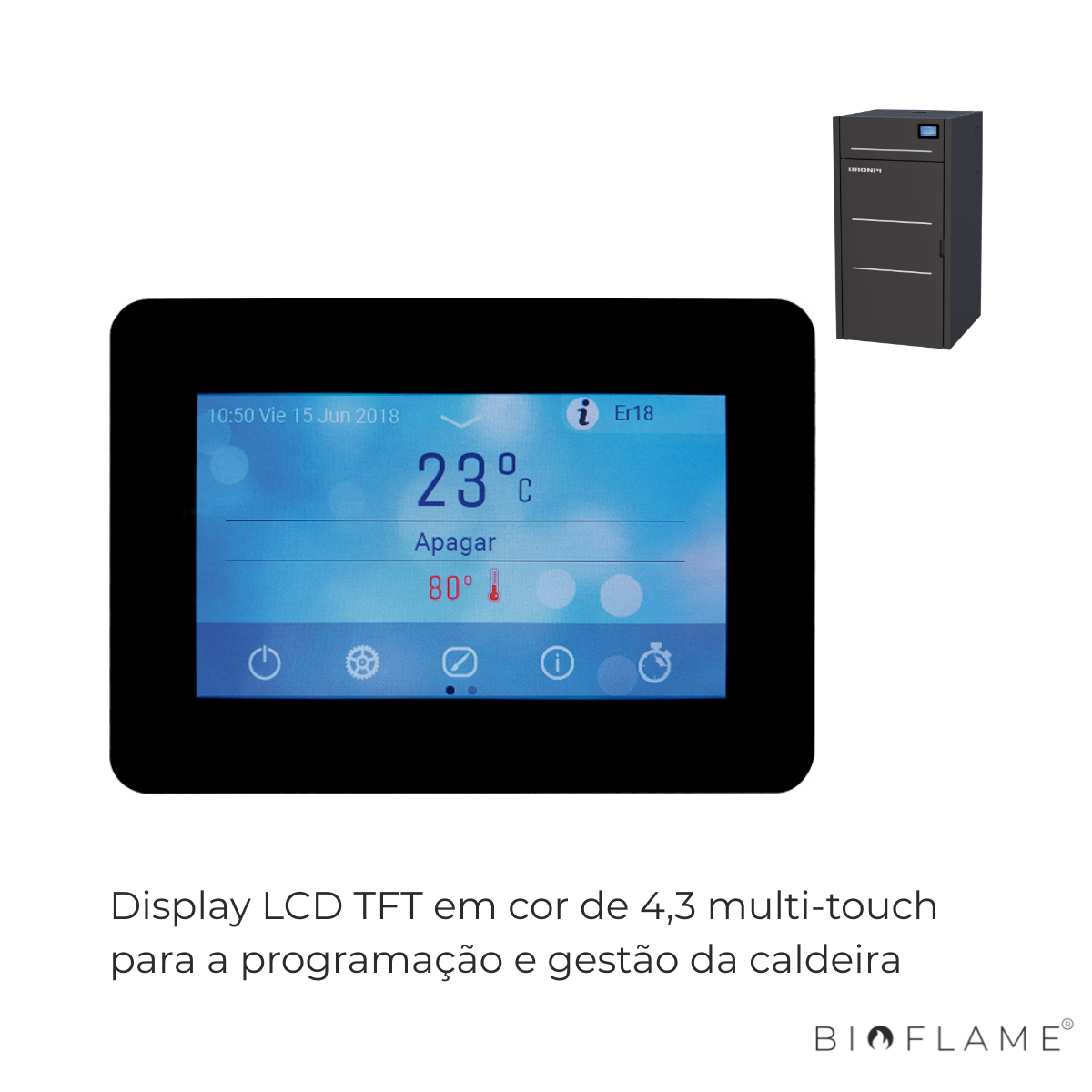 - Características: Sistema de regulação, Fácil Manutenção, Programação, Wifi, Sistema de nível de carga, Display para programação e gestão da caldeira.