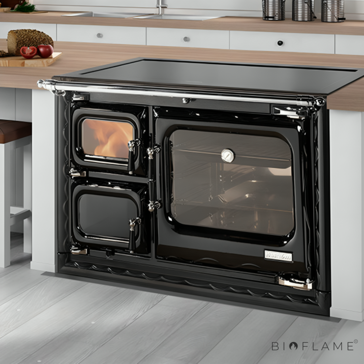O Fogão a lenha Deva, em ferro fundido, ideal para cozinhas amplas, com portas em vidro cerâmico resistente a altas temperaturas que permitem controlar o fogo e o forno. Disponível em versões aberta ou embutida, combina design robusto e sofisticado, facilitando a instalação e manutenção. Perfeita para cozinhar e aquecer com eficiência, é uma solução premium que alia conforto, durabilidade e qualidade superior.