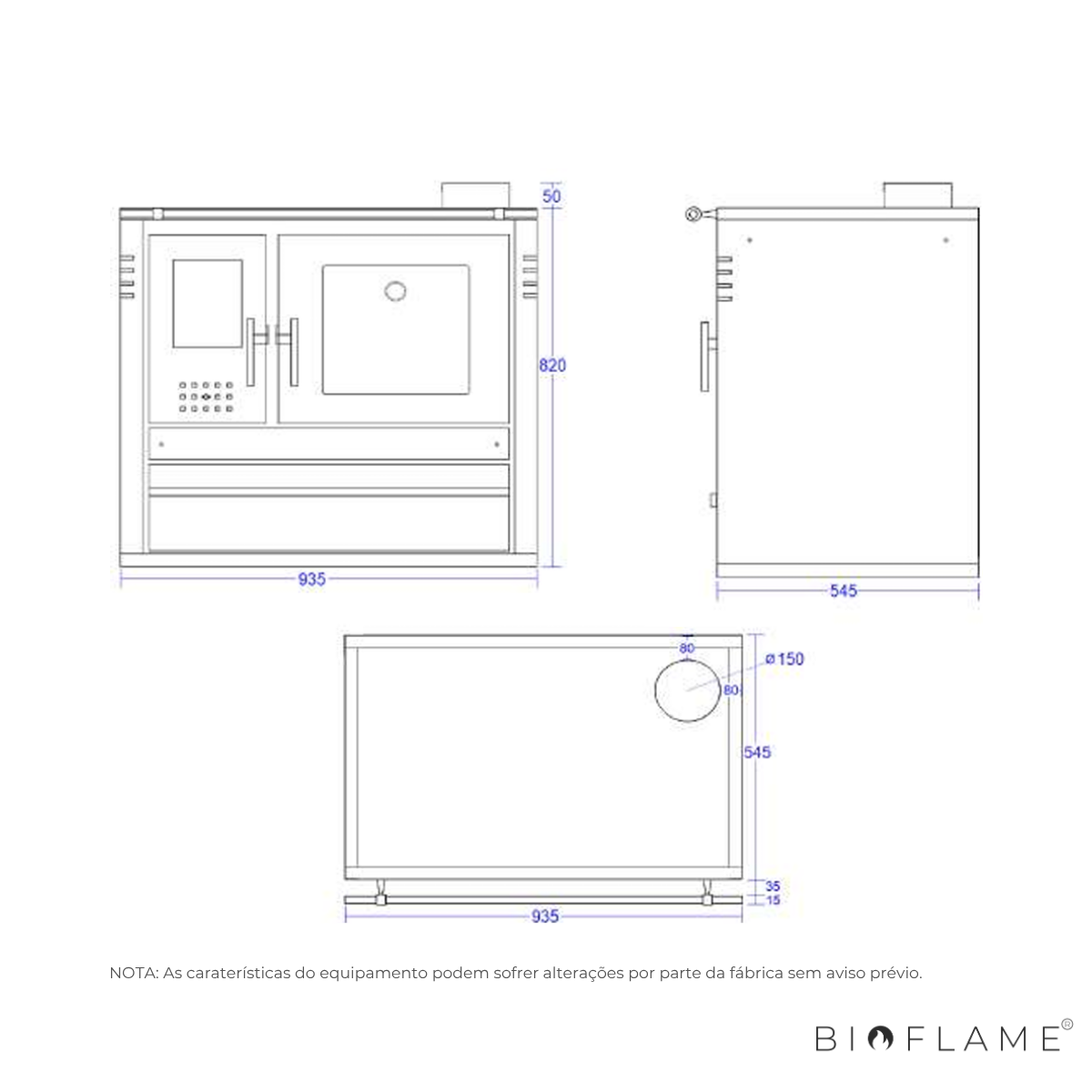 - Diâmetro Saída Fumo: 150 mm