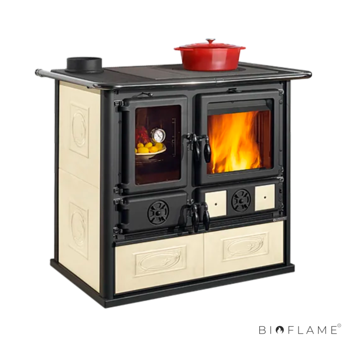 O corpo do fogão é construído em fundição resistente, incluindo portas e bastidor esmaltados, assegurando durabilidade e uma vedação perfeita. A estrutura sólida contribui para a eficiência térmica, prolonga a vida útil do equipamento e oferece um acabamento elegante que se adapta a qualquer cozinha.