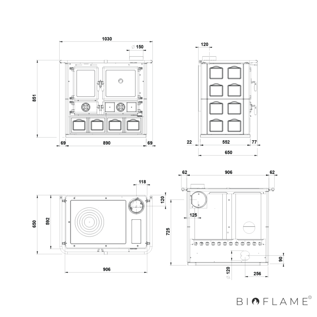 - Dimensões da fornalha (L x A x P): 270 x 302 x 370 mm