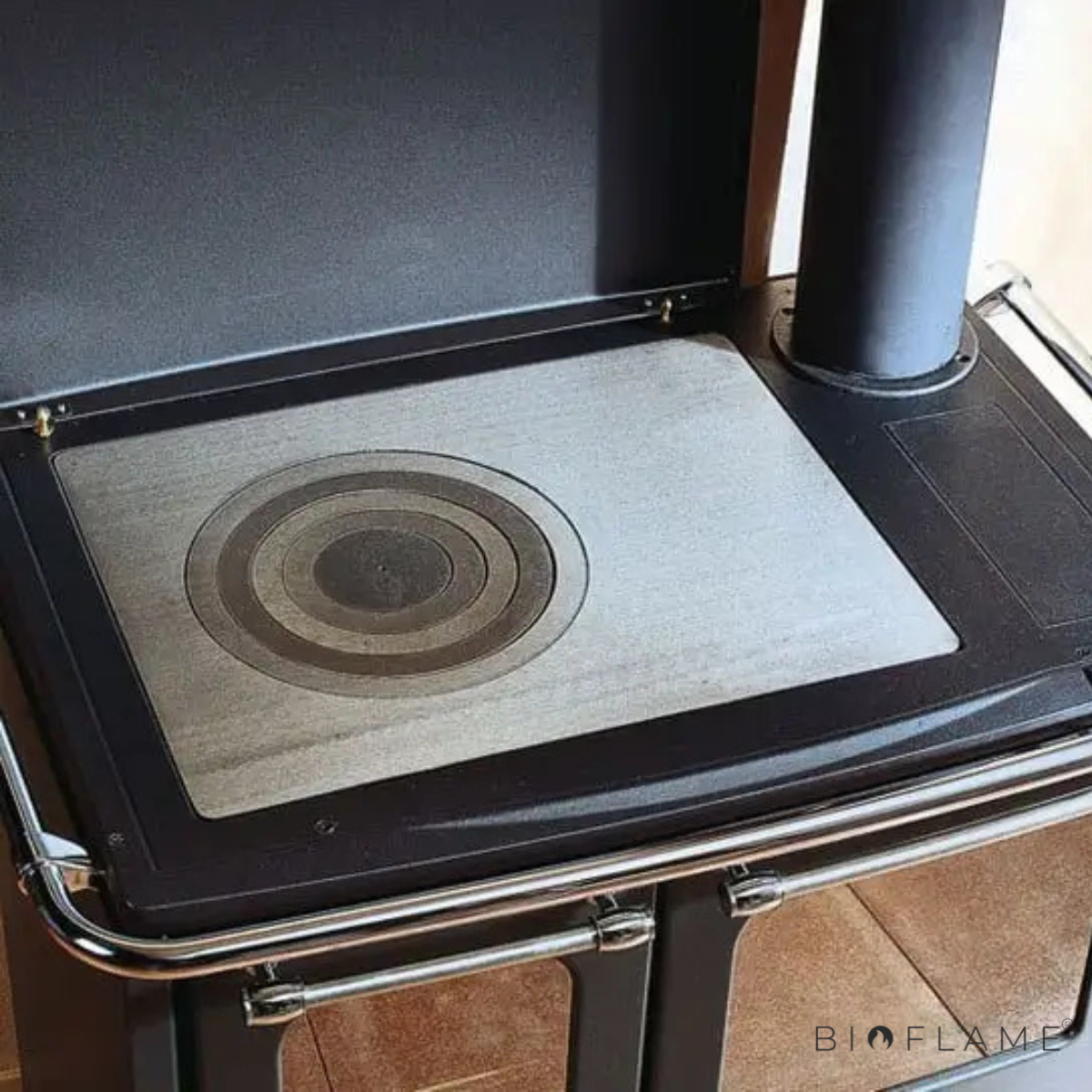 As chapas decorativas para salamandras protegem o chão e a parede do...
