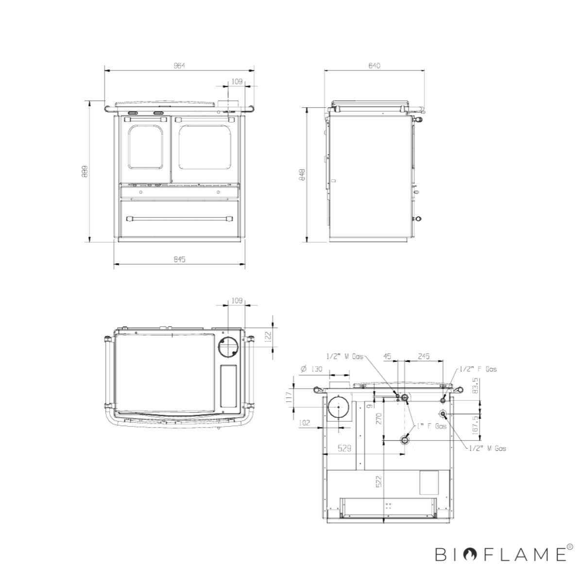- Dimensões da fornalha (L x A x P): 257 x 250 x 395 mm