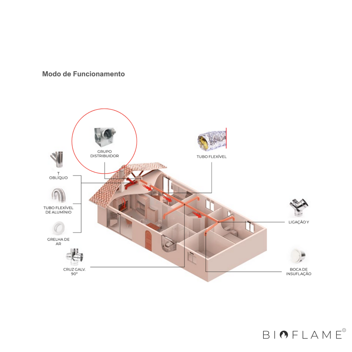 O ar aquecido é conduzido por uma conduta até ao distribuidor. Quando a temperatura do ar atinge cerca de 45ºC, o sistema ativa-se automaticamente, enviando o ar quente para as restantes divisões, proporcionando um aquecimento eficaz e equilibrado em toda a casa.