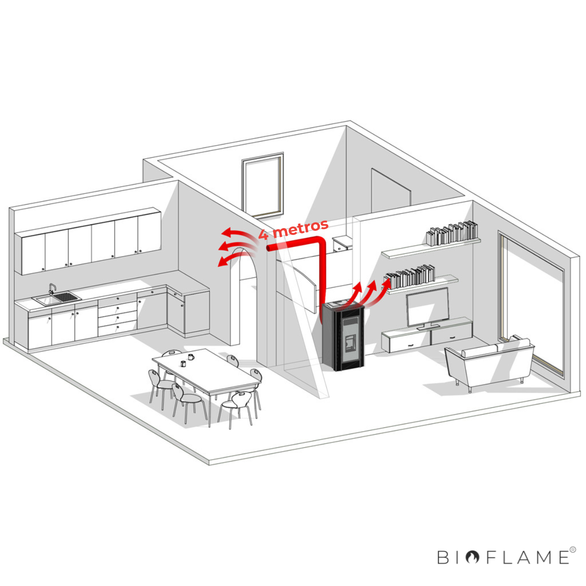 Com o kit de canalização e a instalação de condutas de ar, é possível levar ar quente para outra divisão da casa com um único aparelho, eliminando a necessidade de múltiplos equipamentos.