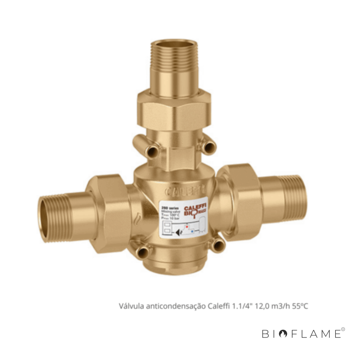 1.1/4″; Kv 12,0 m3/h; Válvula anticondensação com controlo termostático da temperatura de retorno às caldeiras a combustível sólido; Corpo em latão; Pressão máxima: 10 bar; Campo de temperatura: 5 a 100ºC.