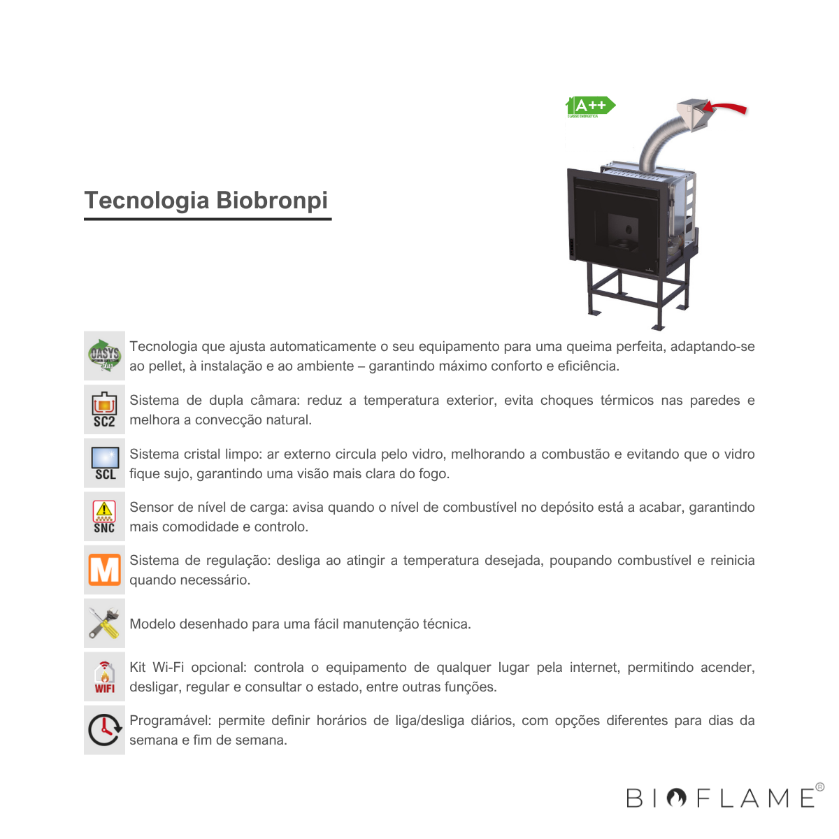 - Características: Sistema de dupla combustão, sistema de vidro limpo, Sistema de regulação, Fácil Manutenção, Sistema de nível de carga, WIFI, Programação, Comando à distância