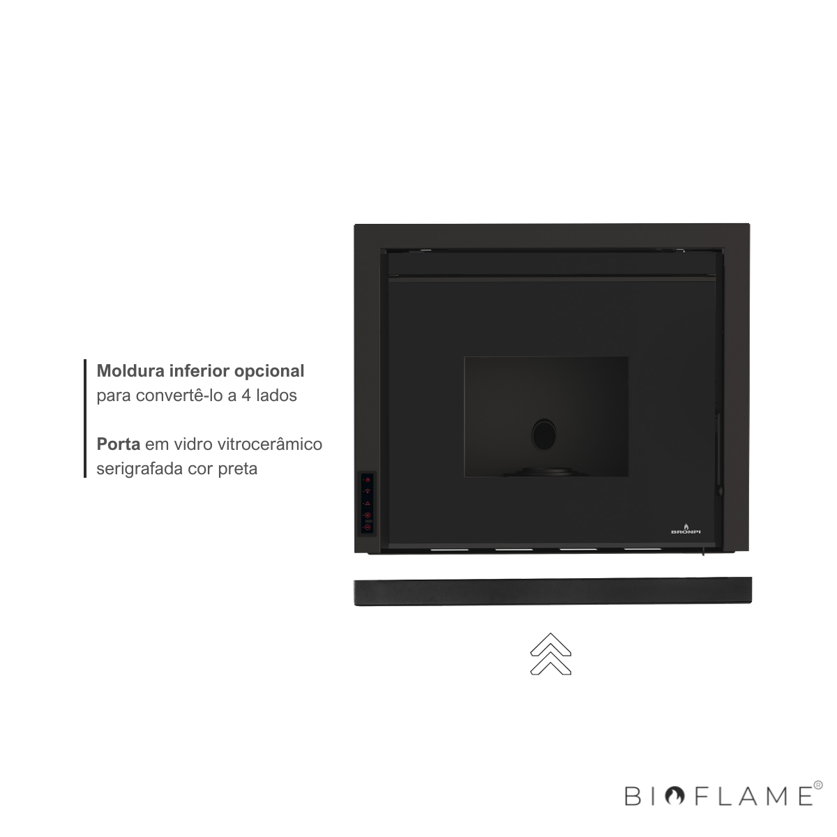 - Opcional: Kit wifi, Kit de carga, Base com pés ajustáveis em altura, Kit com perfil inferior da moldura para que fique com 4 lados, Porta de vidro vitrocerâmico serigrafada na cor preta