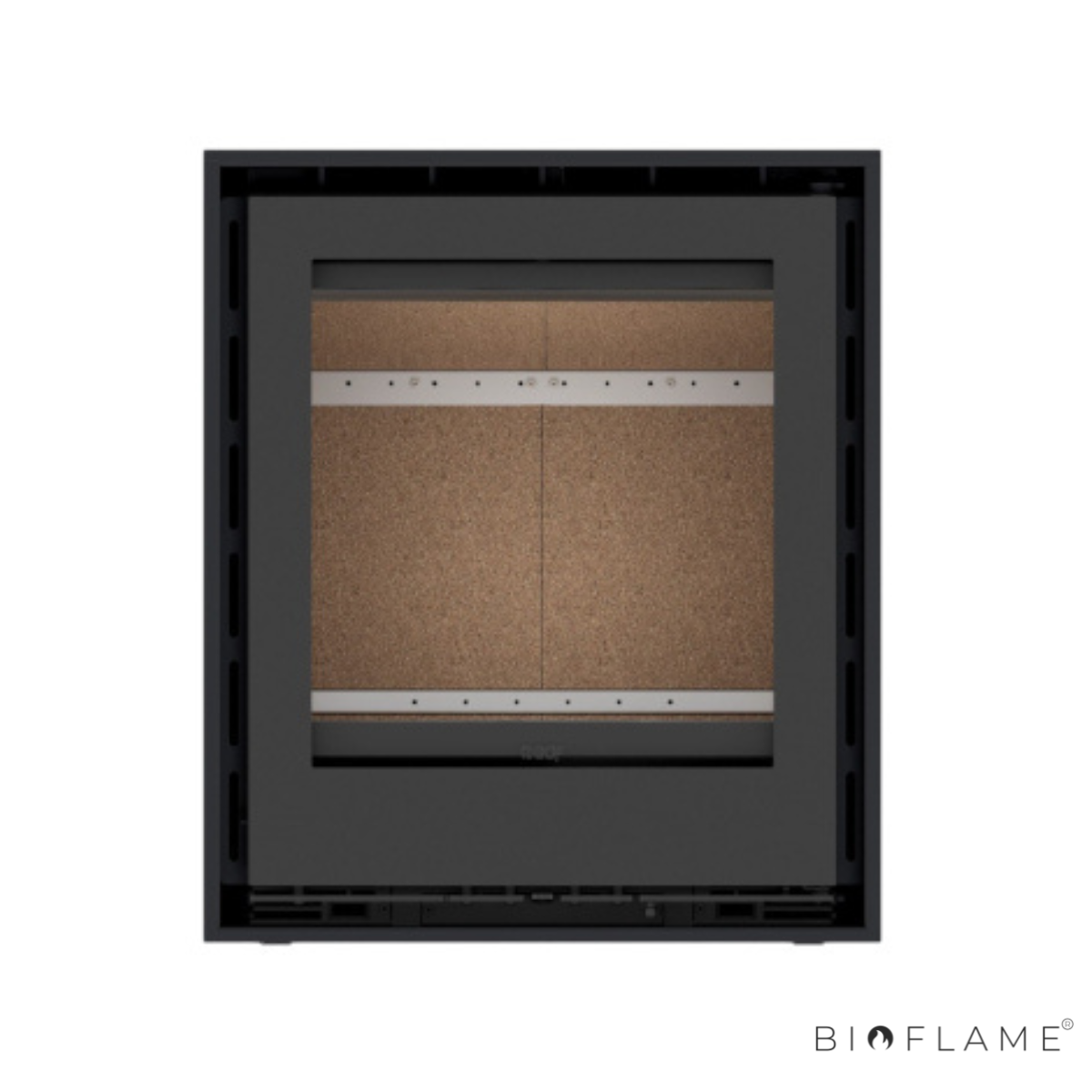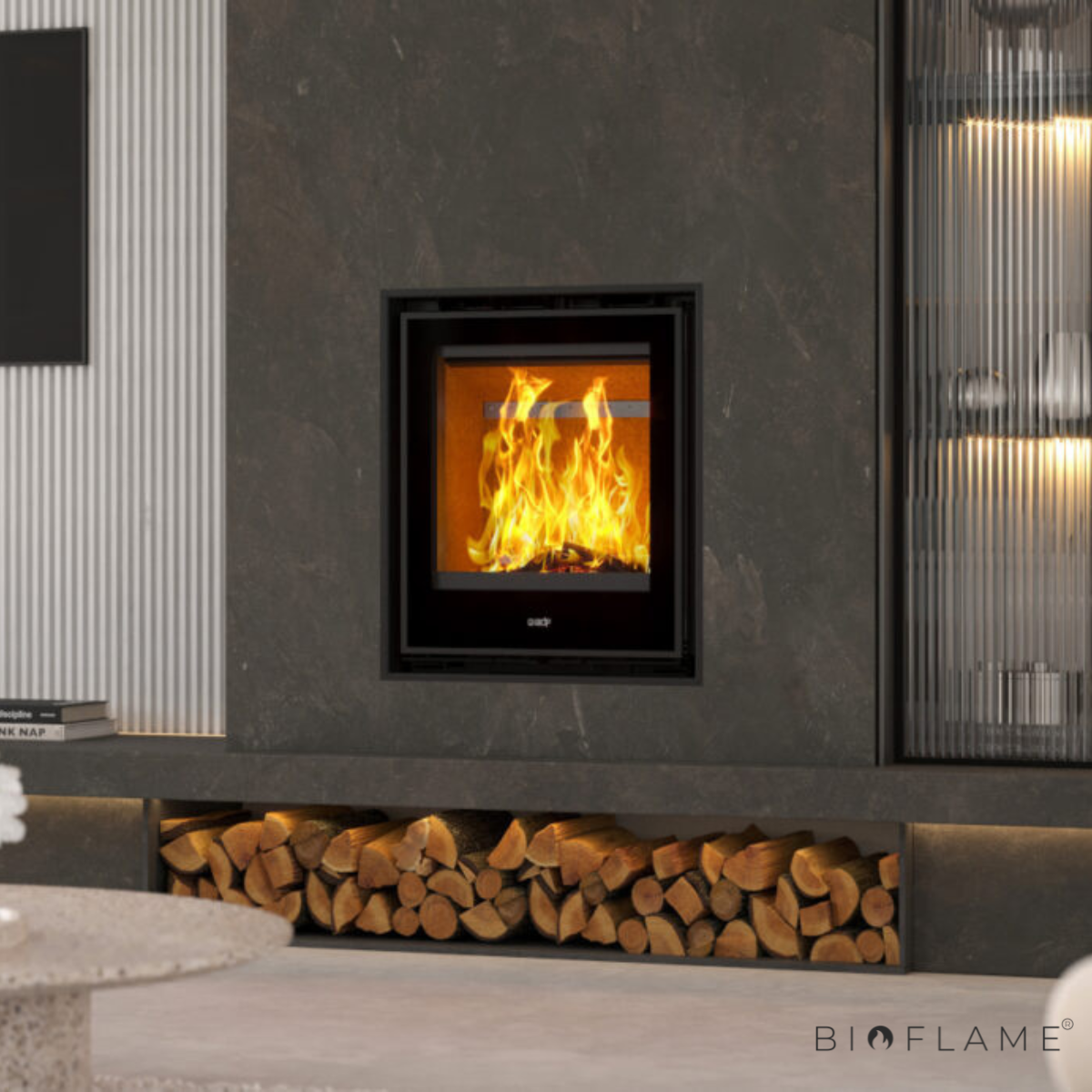 O Recuperador de Calor a Lenha Canalizável ADF Clare 60 Vt apresenta duas opções de porta: em chapa de aço (foto abaixo à esquerda), com um estilo sóbrio e resistente que se integra de forma discreta em qualquer ambiente, ou em vidro serigrafado (foto abaixo à direita), que oferece um design mais moderno e elegante, destacando o efeito visual das chamas.