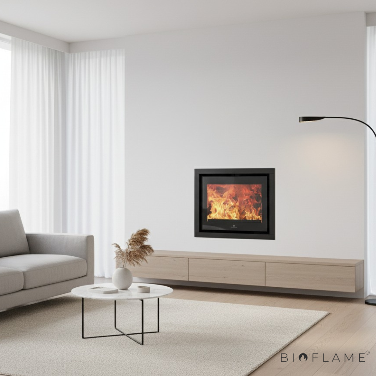 O Recuperador de Calor a Lenha Canalizável Fogo Montanha Design E709 tem 9,4 kW de potência, dupla combustão, câmara estanque e um eficaz sistema de vidro limpo, que assegura uma visão desobstruída das chamas. Possui ventilador tangencial silencioso, porta com fecho automático, interior de elevada resistência térmica e opção de entrada de ar externo com kit. Compatível com controlo por smartphone, GLA e WiFi (opcionais), está em conformidade com o Ecodesign, oferecendo desempenho eficiente, conforto e segurança.