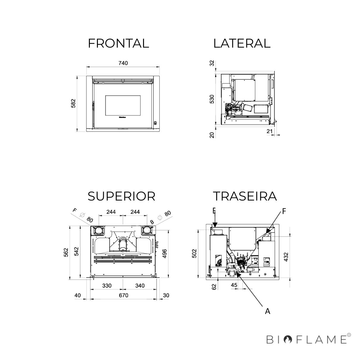 - Características: Sistema de vidro limpo, Autoreacendimento, Radiocomando