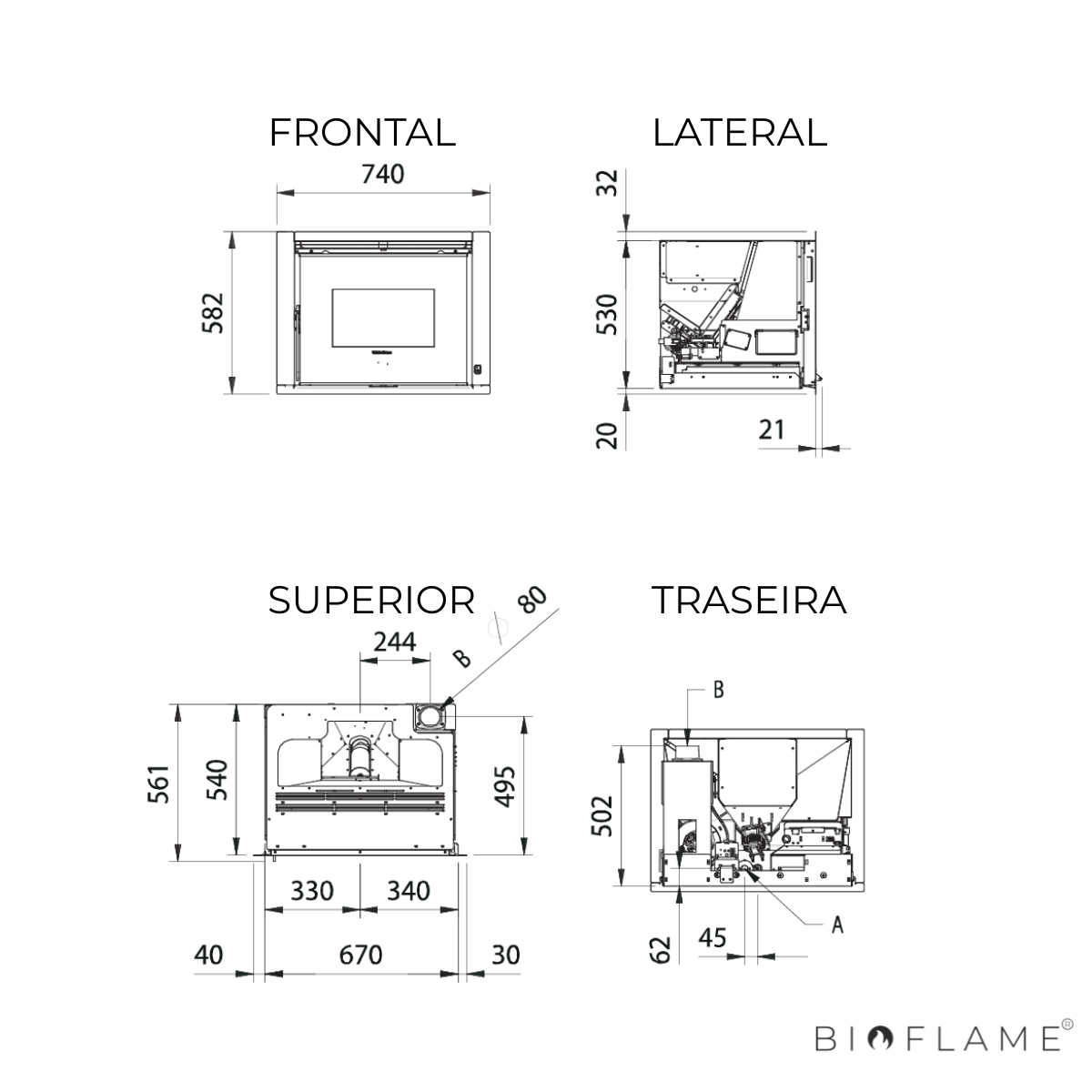- Características: Sistema de vidro limpo, Autoreacendimento, Radiocomando