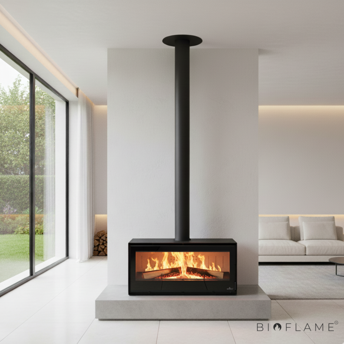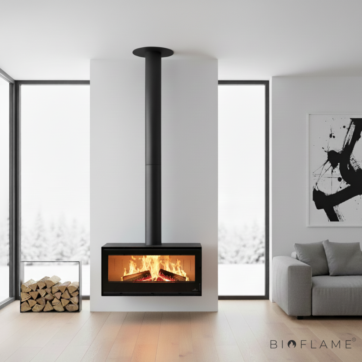 A Cairo 110 Box combina design moderno, elegância e alto desempenho num único equipamento. Com 13 kW de potência, rendimento de 81% e capacidade para aquecer até 325 m³, garante calor eficiente e constante. As suas três faces envidraçadas proporcionam uma visão panorâmica da chama, criando um ambiente acolhedor e sofisticado. A versão suspensa valoriza o espaço, conferindo leveza visual e um toque contemporâneo à divisão, perfeita para quem procura estilo e funcionalidade.