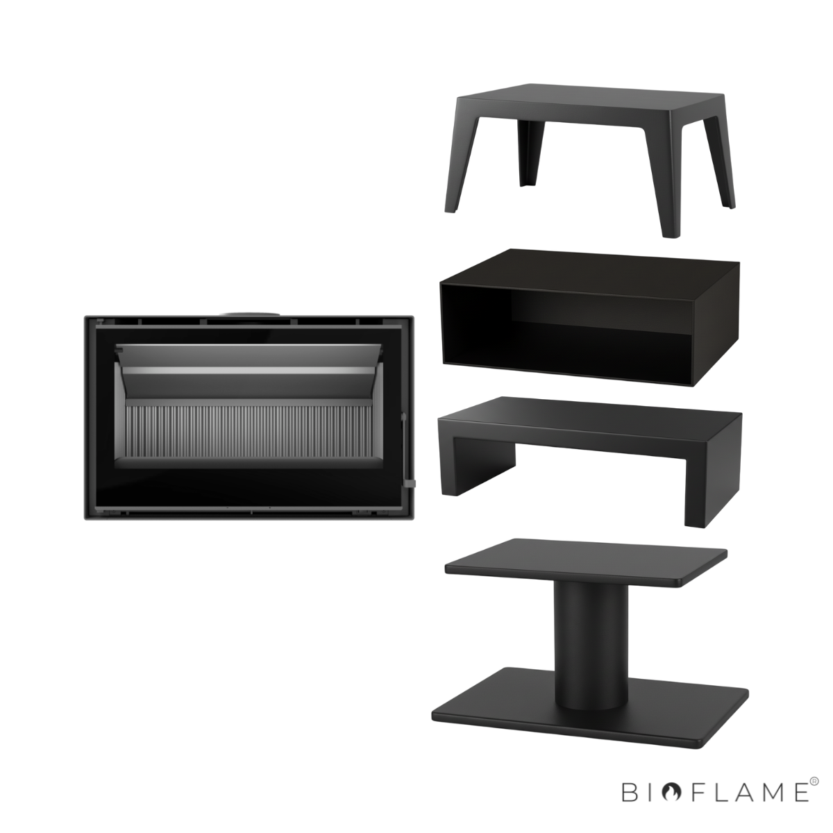 - Base standard – Base com a largura exata da salamandra, que também funciona como lenheiro, unindo praticidade e estilo num único elemento.