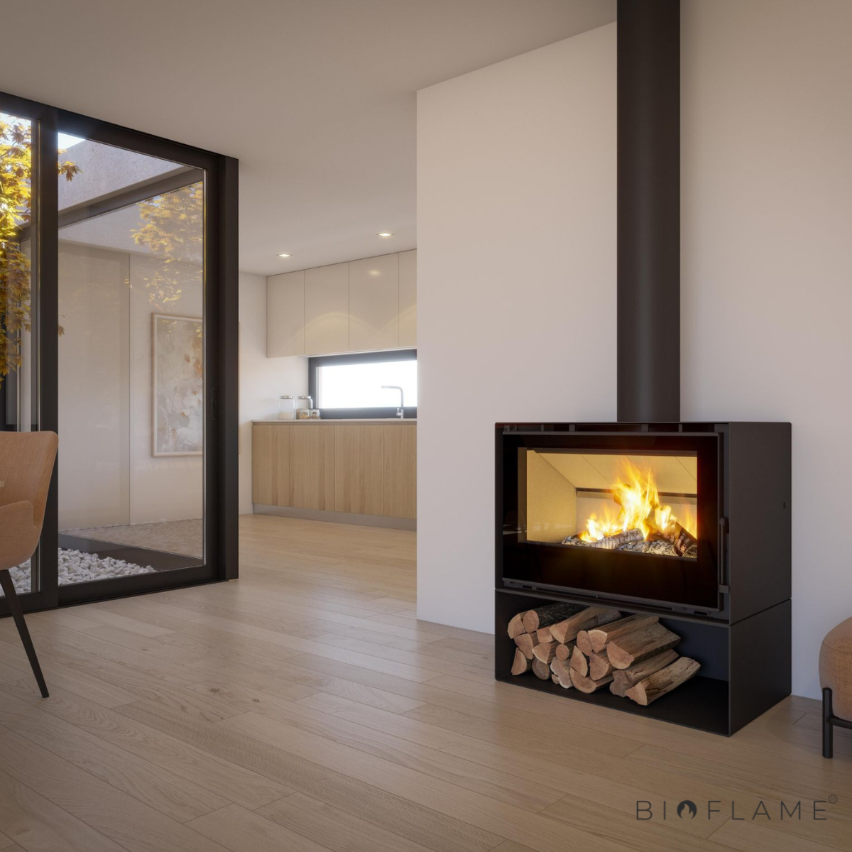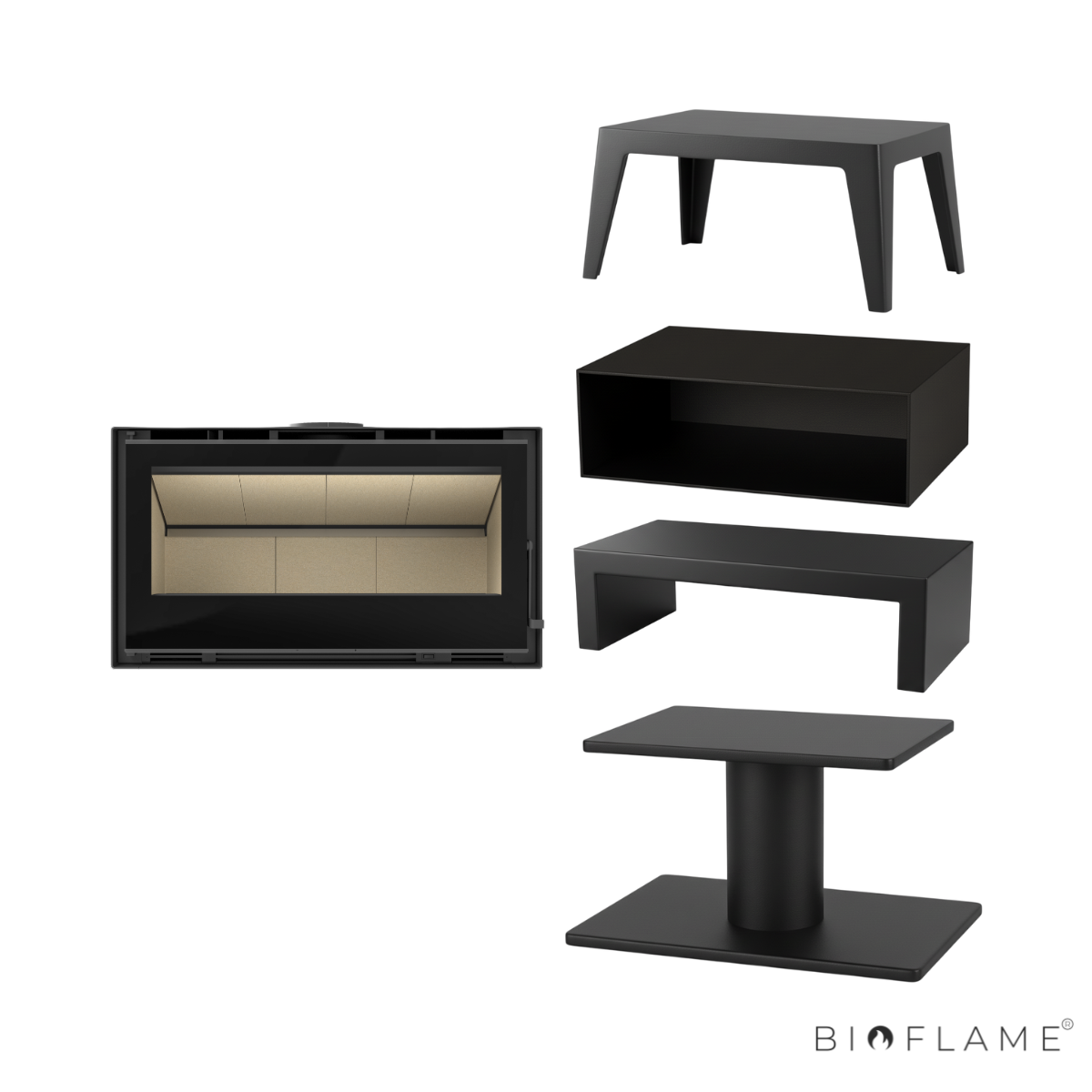 - Base standard – Base com a largura exata da salamandra, que também funciona como lenheiro, unindo praticidade e estilo num único elemento.