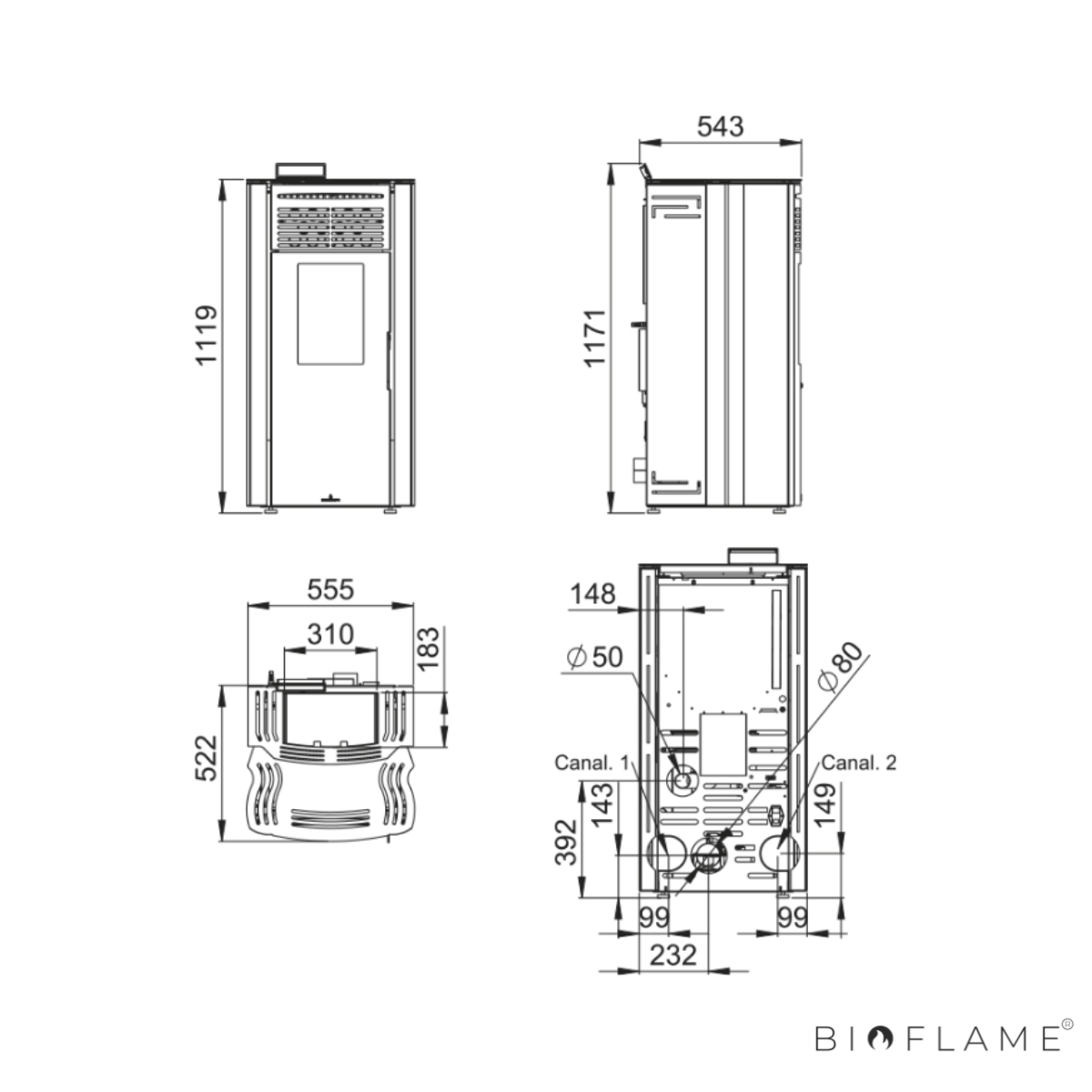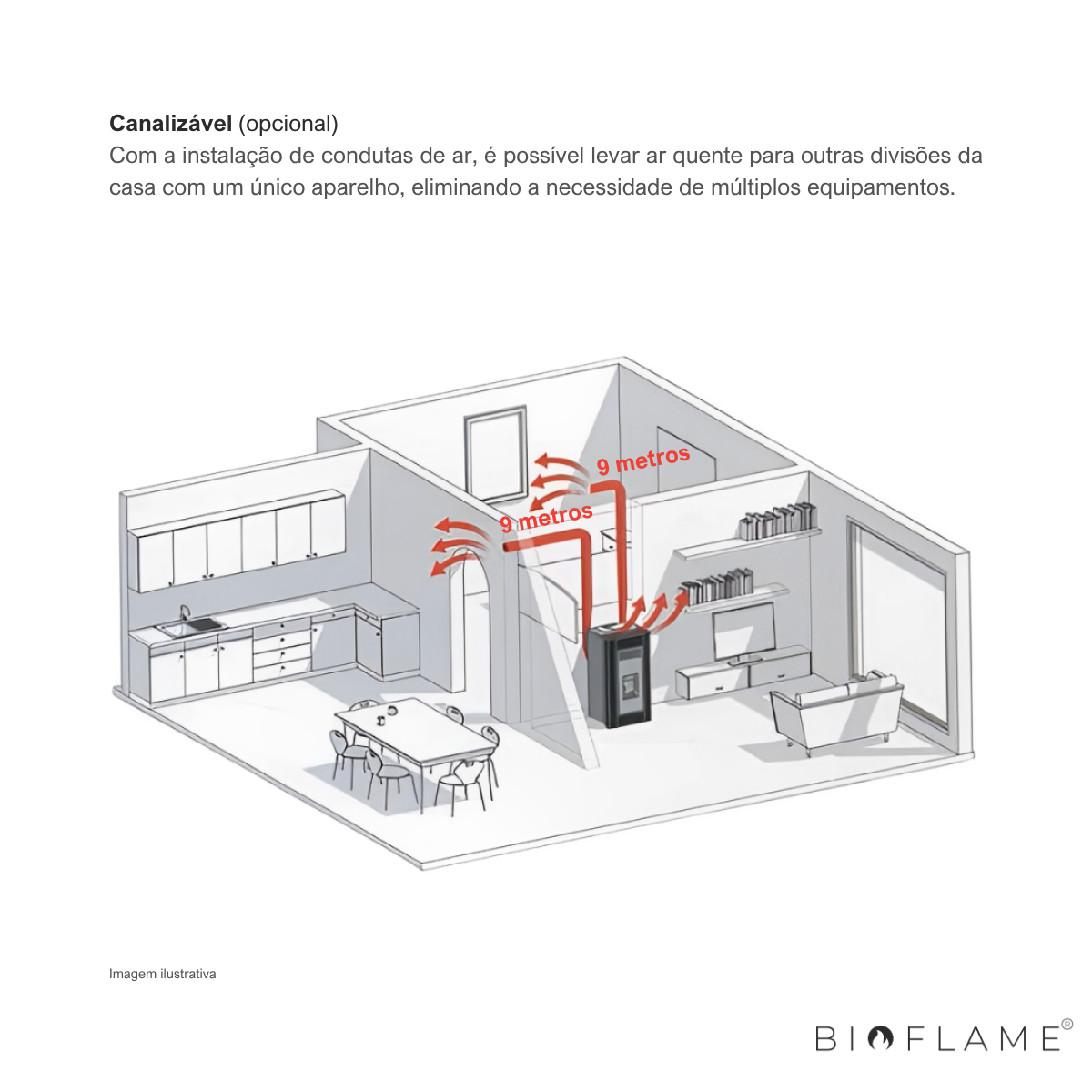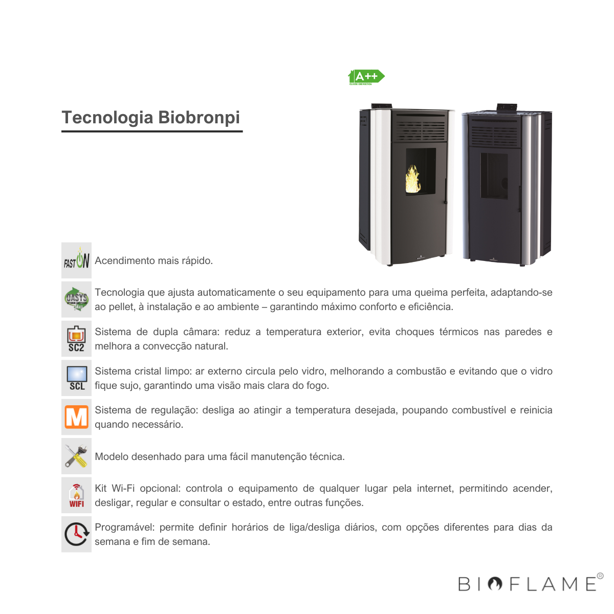 - Características: Resistência de cerâmica- aquecimento mais rápido, Sistema de dupla combustão, sistema de vidro limpo, Sistema de regulação, Fácil Manutenção, WIFI, Programação, Válvula de sobrepressão da câmara, T de aço inoxidável incluído, Comando à distância