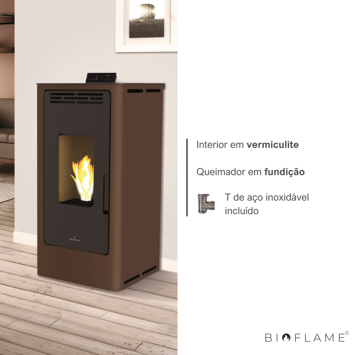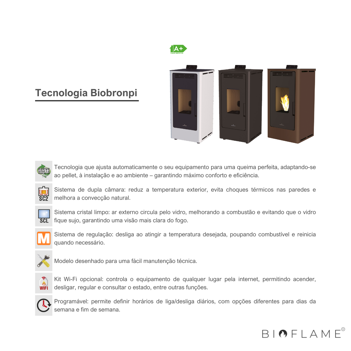 - Características: Sistema de vidro limpo, Fácil Manutenção, sistema de dupla combustão, Programável, Sistema de Regulação, Wifi, T em aço inoxidável, Válvula de sobrepressão da câmara, Puxador com sistema de bloqueio, Acumulador térmico em fundição, Silenciosa.