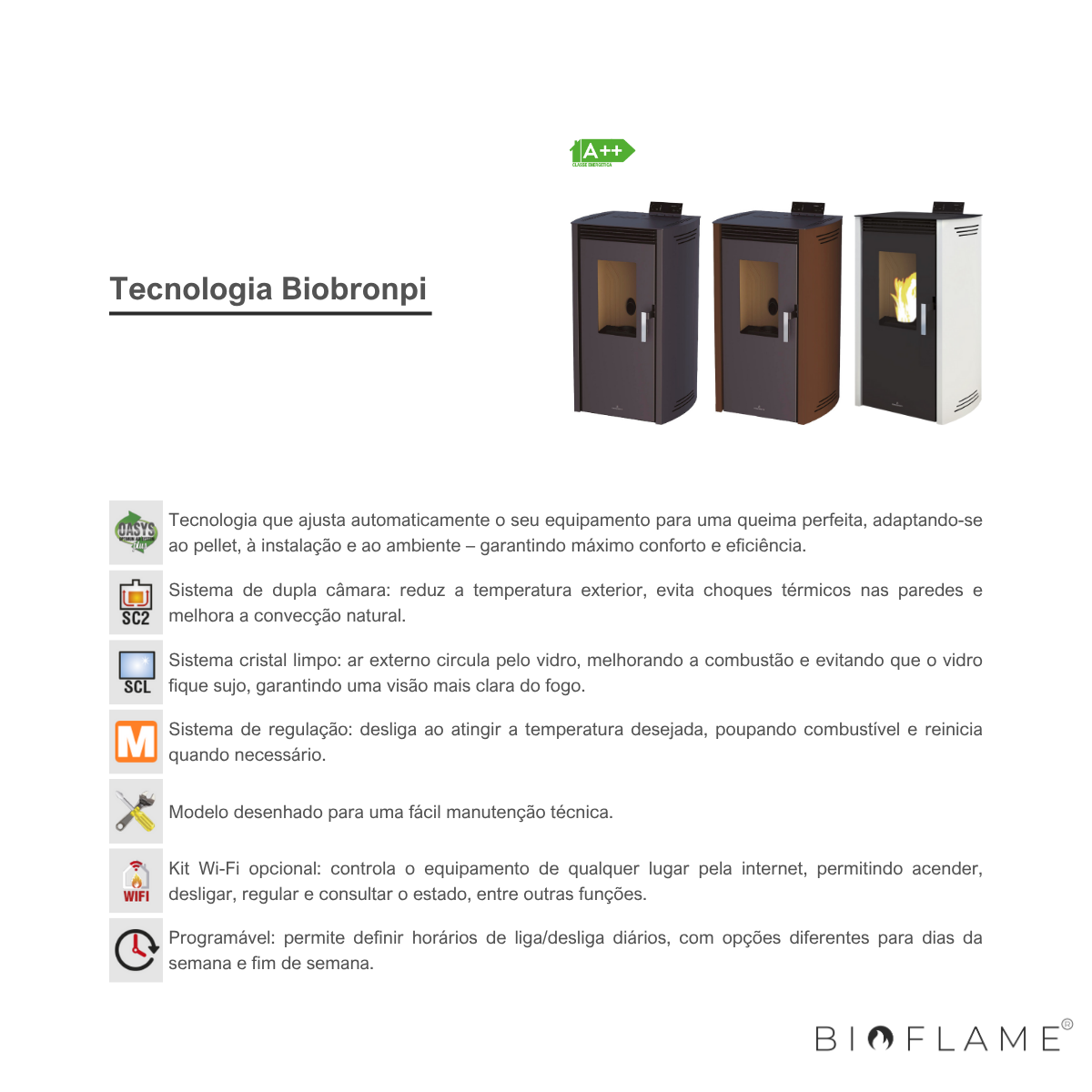 - Características: Sistema de vidro limpo, Fácil Manutenção, sistema de dupla combustão, Programável, Sistema de Regulação, Wifi, Válvula de sobrepressão de câmara, T de aço inoxidável, Inclui acumulador térmico em fundição