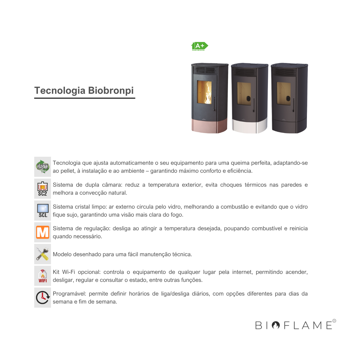 - Características: Sistema de vidro limpo, Fácil Manutenção, sistema de dupla combustão, Programável, Sistema de Regulação, Resistência em cerâmica, acendimento mais rápido, Wifi, T em aço inoxidável, Válvula de sobrepressão da câmara.