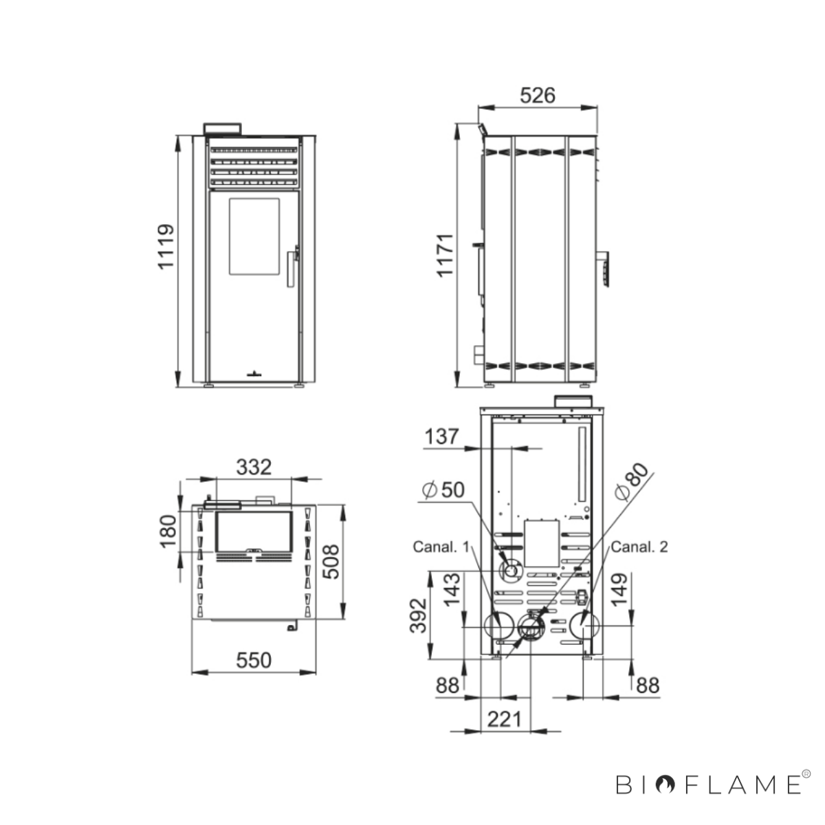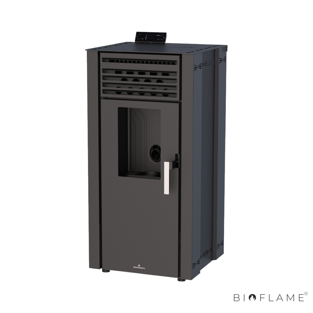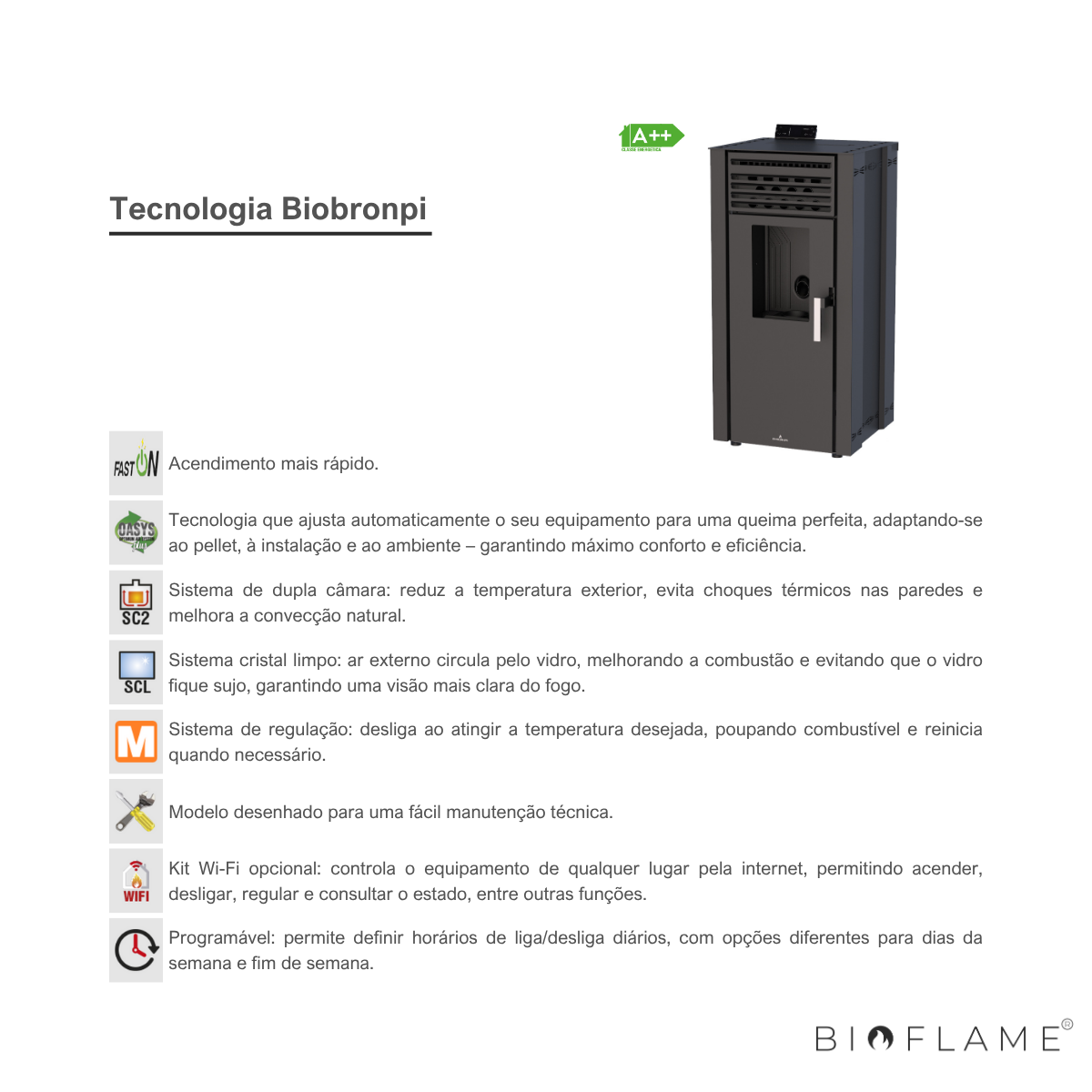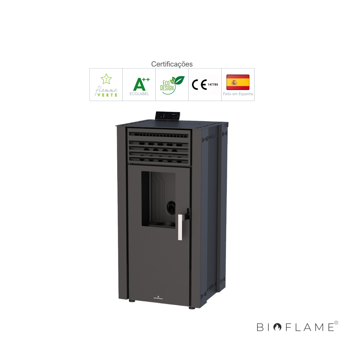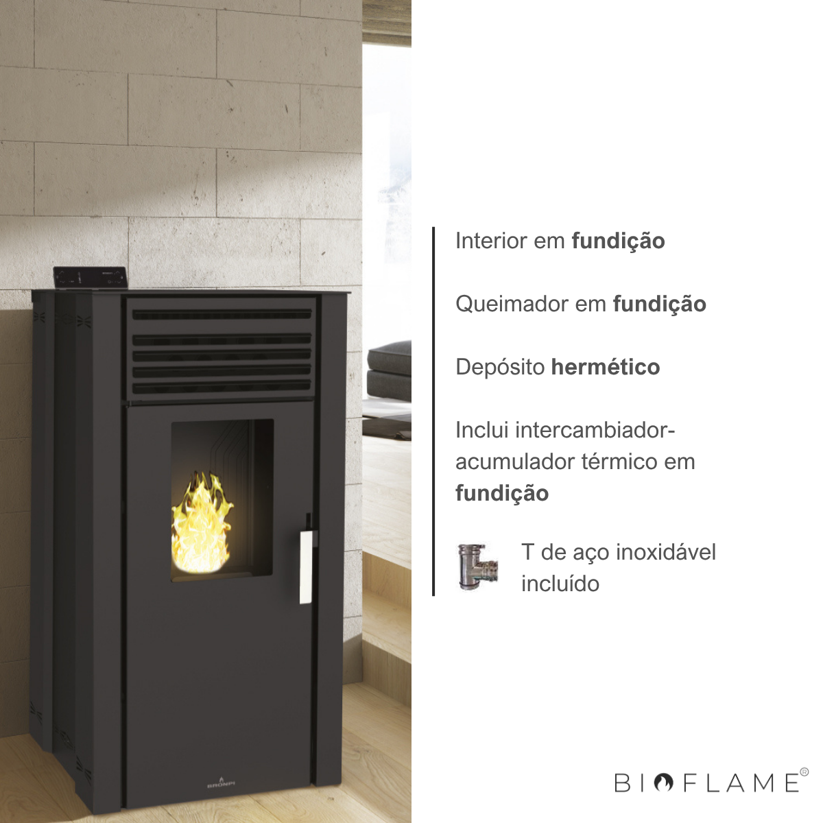 - Características: Resistência de cerâmica- aquecimento mais rápido, Sistema de dupla combustão, sistema de vidro limpo, Sistema de regulação, Fácil Manutenção, WIFI, Programação, Válvula de sobrepressão da câmara, T de aço inoxidável incluído, Acumulador térmico em fundição