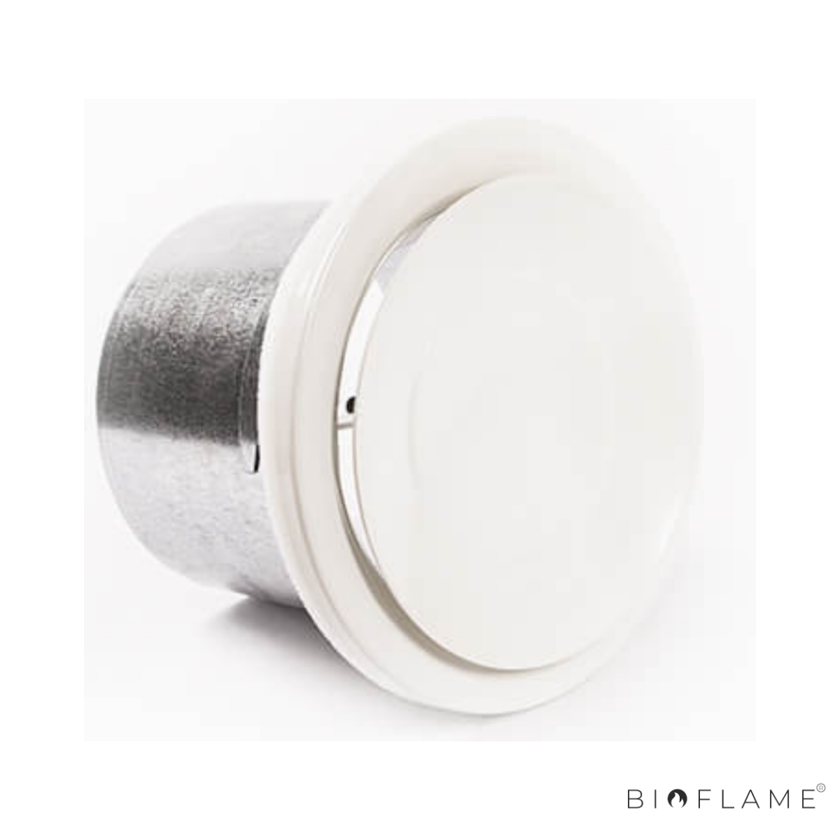 Válvula de insuflação em plástico branco, com pré aro, especialmente concebida para uma instalação fácil e adaptável em sistemas de ventilação e distribuição de ar quente.